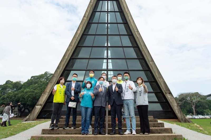 立法院副院長蔡其昌與關心修繕工程的東海大學校友們共同會勘路思義教堂。