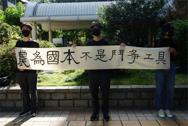藍委在立法院要求總統蔡英文、副總統賴清德、行政院長陳建仁為雞蛋進口不當道歉。年輕人在立法院外舉布條訴求:農為國本不是鬥爭工具。(照片/民眾提供)
