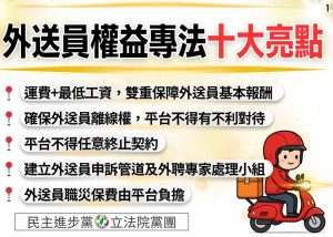 民進黨立院黨團強調,外送員權益專法 十大亮點: