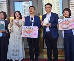 民進黨立院黨團幹事長鍾佳濱、書記長陳培瑜、政策會執行長吳思瑤,今天上午現身立法院議場前拿著肉燥飯、爌肉飯,呼籲民眾多吃台灣豬肉。鍾佳濱表示,「盧媽媽道歉了,豬還回來了」,該做的司法調查要追究到底。
