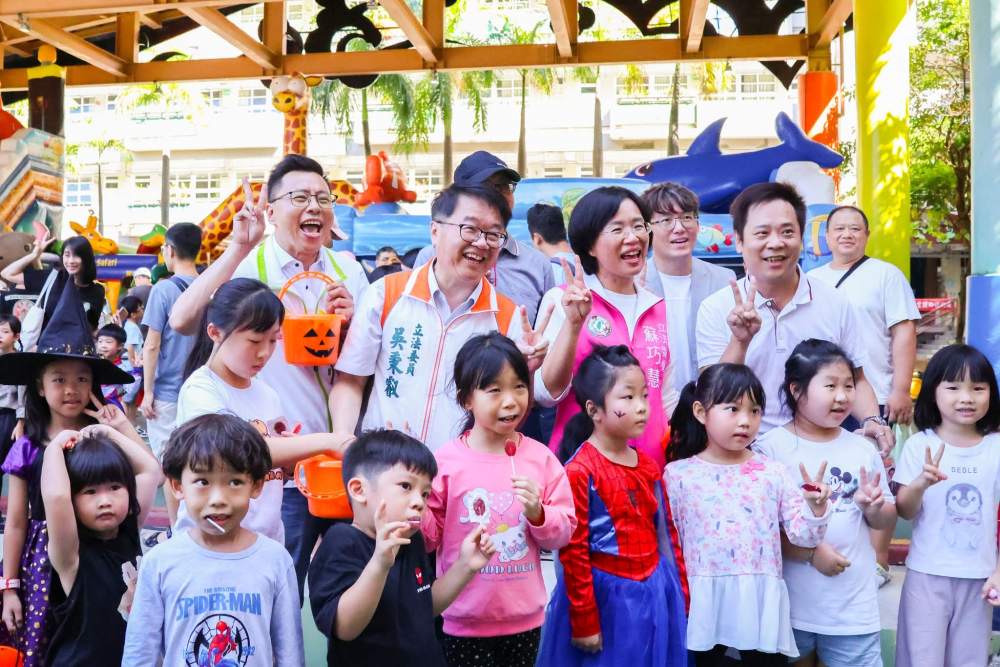 立委吳秉叡、蘇巧慧與穿著萬聖節造型的孩童開心合照。(立委吳秉叡國會辦公室提供)