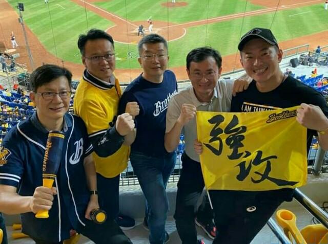 蔡其昌(右三)與立委張廖萬堅(左一)、莊競程(左二)、陳柏惟(右一)在台中洲際棒球場,觀看中信兄弟象與統一獅爭霸賽。